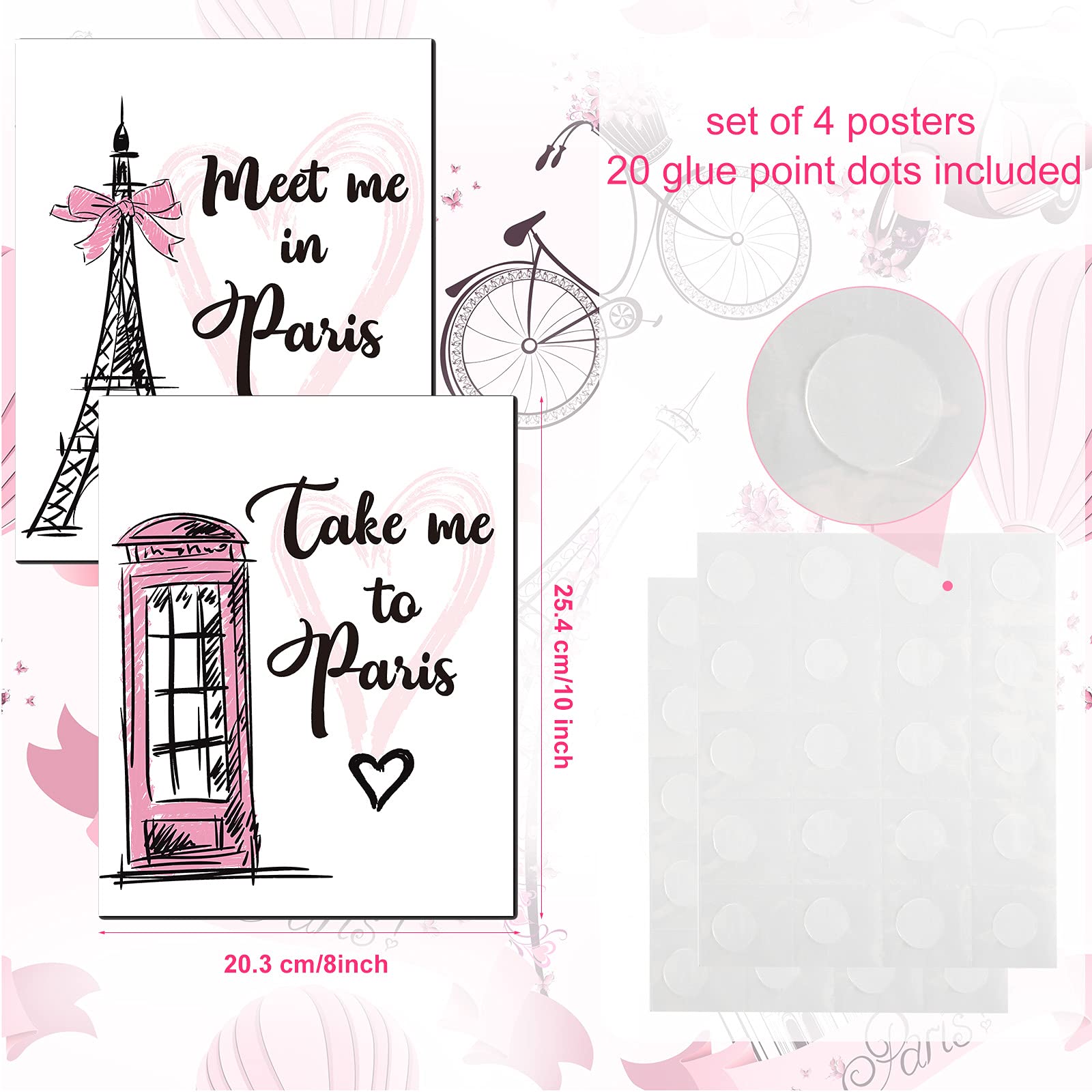 - Package contents: these Paris wall art prints are unframed and have 4 different styles, and equipped with 1 sheet (20 pieces) adhesive dots, enough quantity for you to decorate your room, whisk yourself away on a romantic and nice adventure through Paris