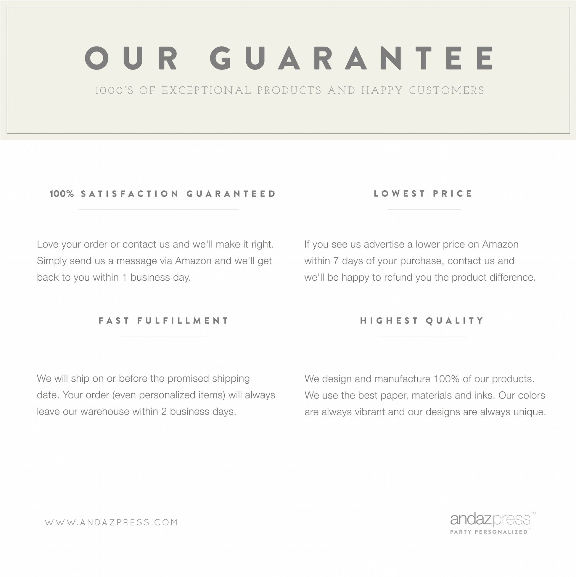 Details: Andaz Press is a premier designer and manufacturer of party decor, specializing in personalized party supplies. Andaz Press products are always made with the highest quality paper, materials, and inks. Thank you for making Andaz Press a part of your special event! For print templates, assistance, or just to say Hi!, please email us at hello [at] andazpress.com. We'd love to hear from you! Sign up for sneak peeks and discounts at www.andazpress.com