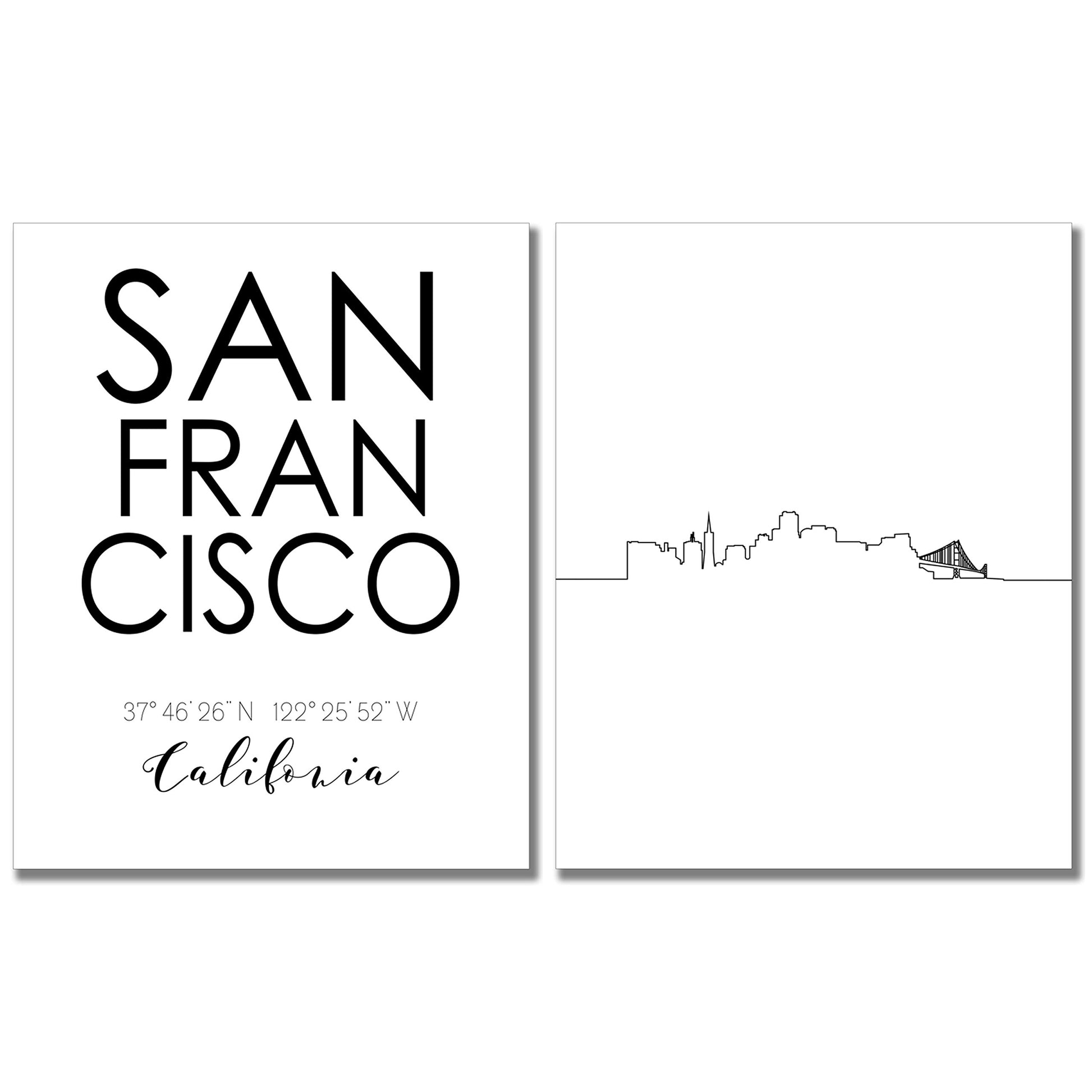 San Francisco City Skyline Wall Décor Prints - Set of 2 (8x10) Art Photos - Typography Minimalist Poster