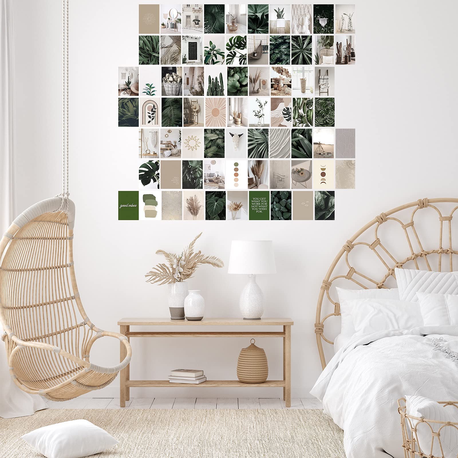 - 【70 PCS Aesthetic Pictures】Selected 70pcs boho style photos of green forest plants and beige cute things. These aesthetic pictures can be combined into a very artistic wall decoration. The size of each picture is 4x6 inches, and 70 pictures can cover up to 12 square feet of wall area.