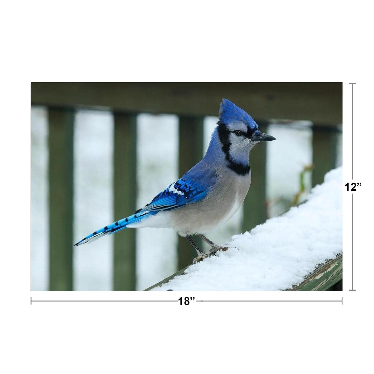 Bluejay Perching on Snow Covered Railing Blue Jay Bird Photo Photograph Feathers New England Winter Nature Animal Cool Wall Decor Art Print Poster 18x12