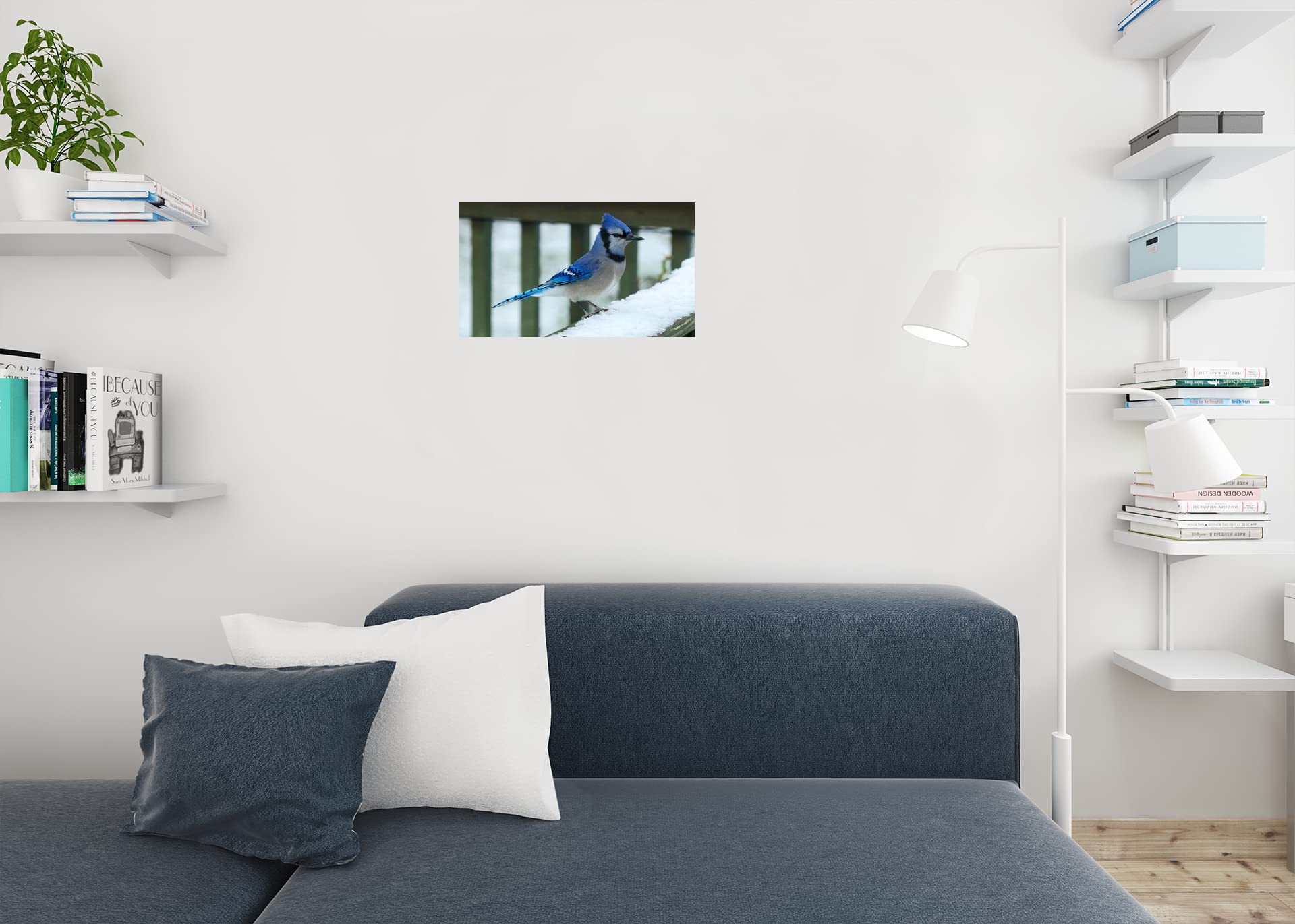 Details: Bluejay Perching on Snow Covered Railing Photo Photograph Cool Wall Decor Art Print Poster 18x12