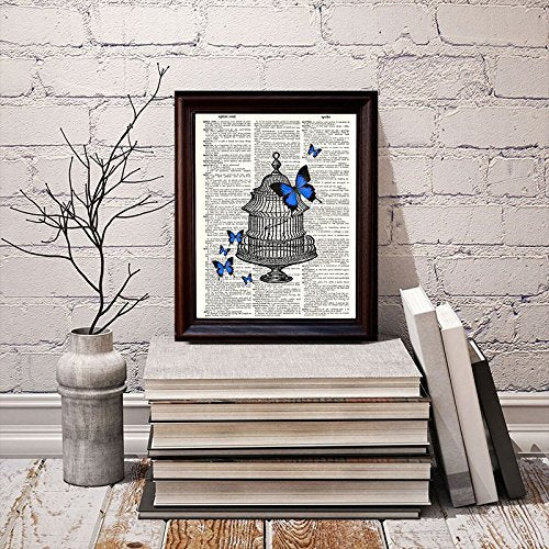 Details: This design featuring butterflies outside of a birdcage is printed on beautiful vintage dictionary paper. These prints are definitely a conversation starter and look fabulous as a wall hanging. Each design is carefully selected and then printed on vintage dictionary paper giving it that beautiful golden color that only comes from age. Since we use real book pages some unevenness or spotting occurs, this only adds another layer to the print, making each one truly unique. Dimensions are approximately 8" W x 10.5" L. *** Frames are not included.***
