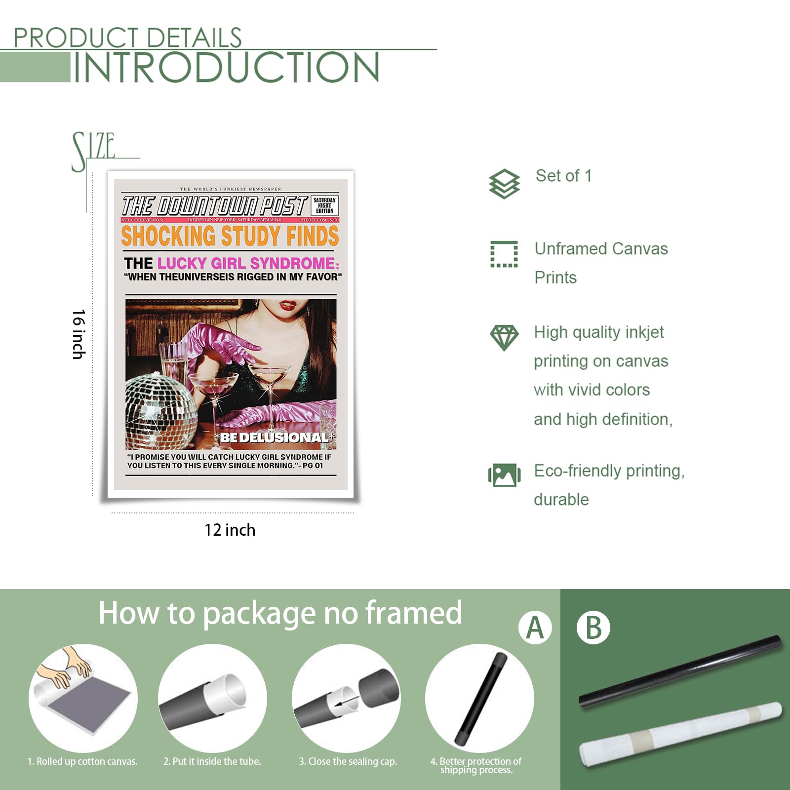 Disco Ball Decor Funky Canvas Wall Art Groovy Poster Print Lucky Girl Drink Champagne Preppy Pictures Trendy Newspapers Wall Decor for Living Room Bar Cart 12x16in Unframed