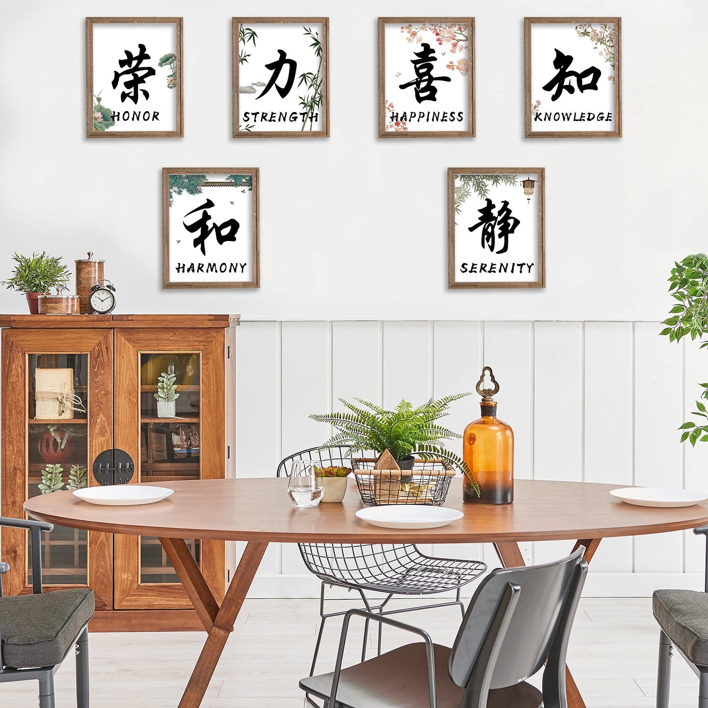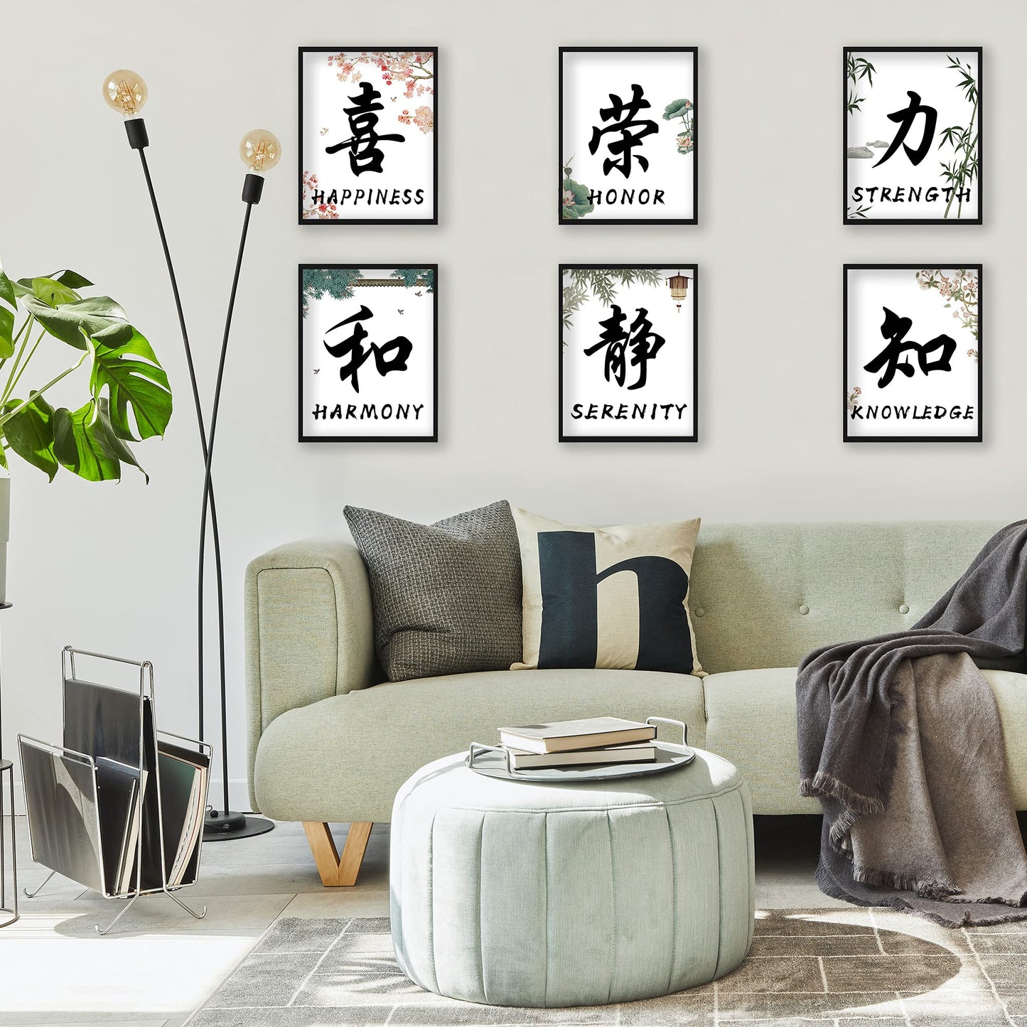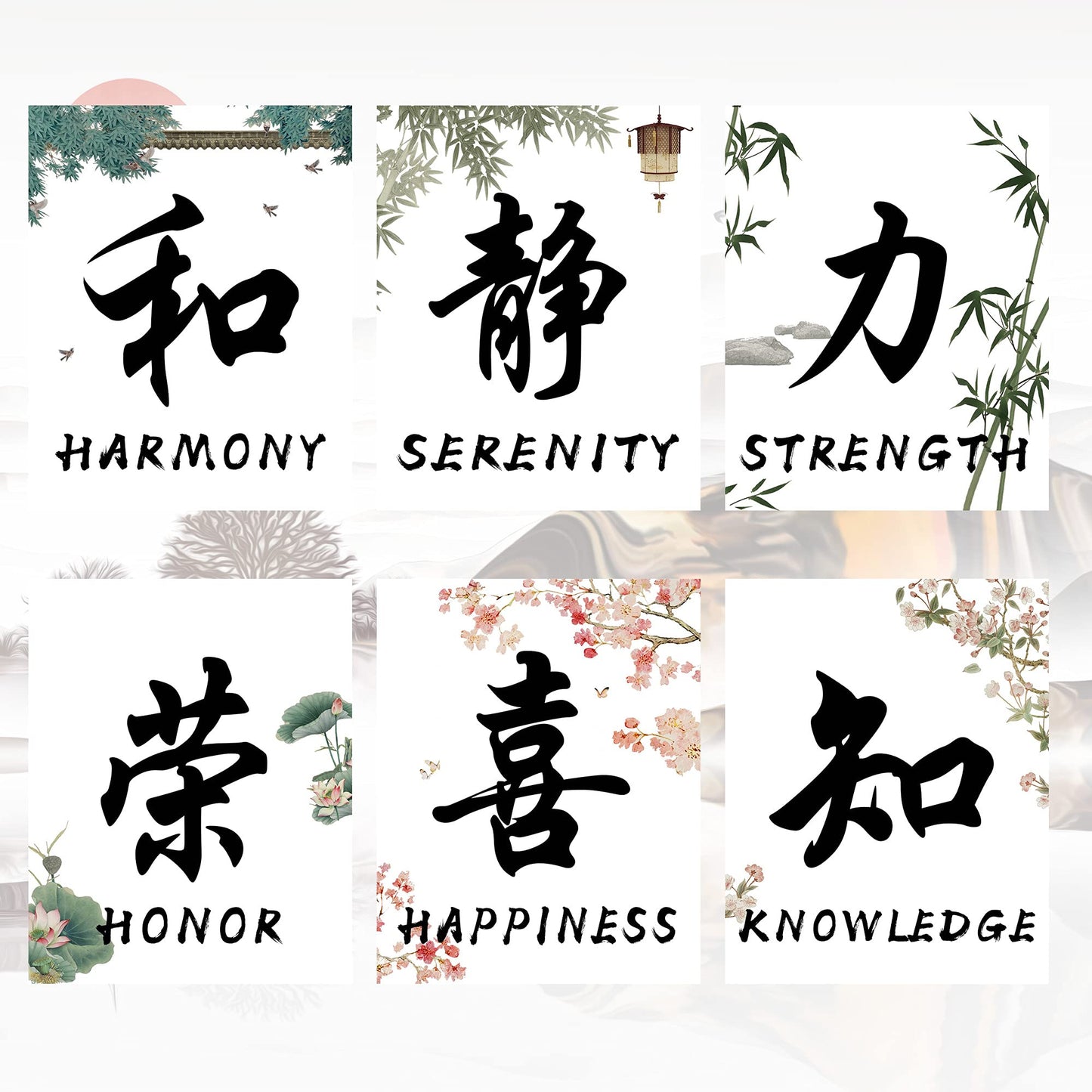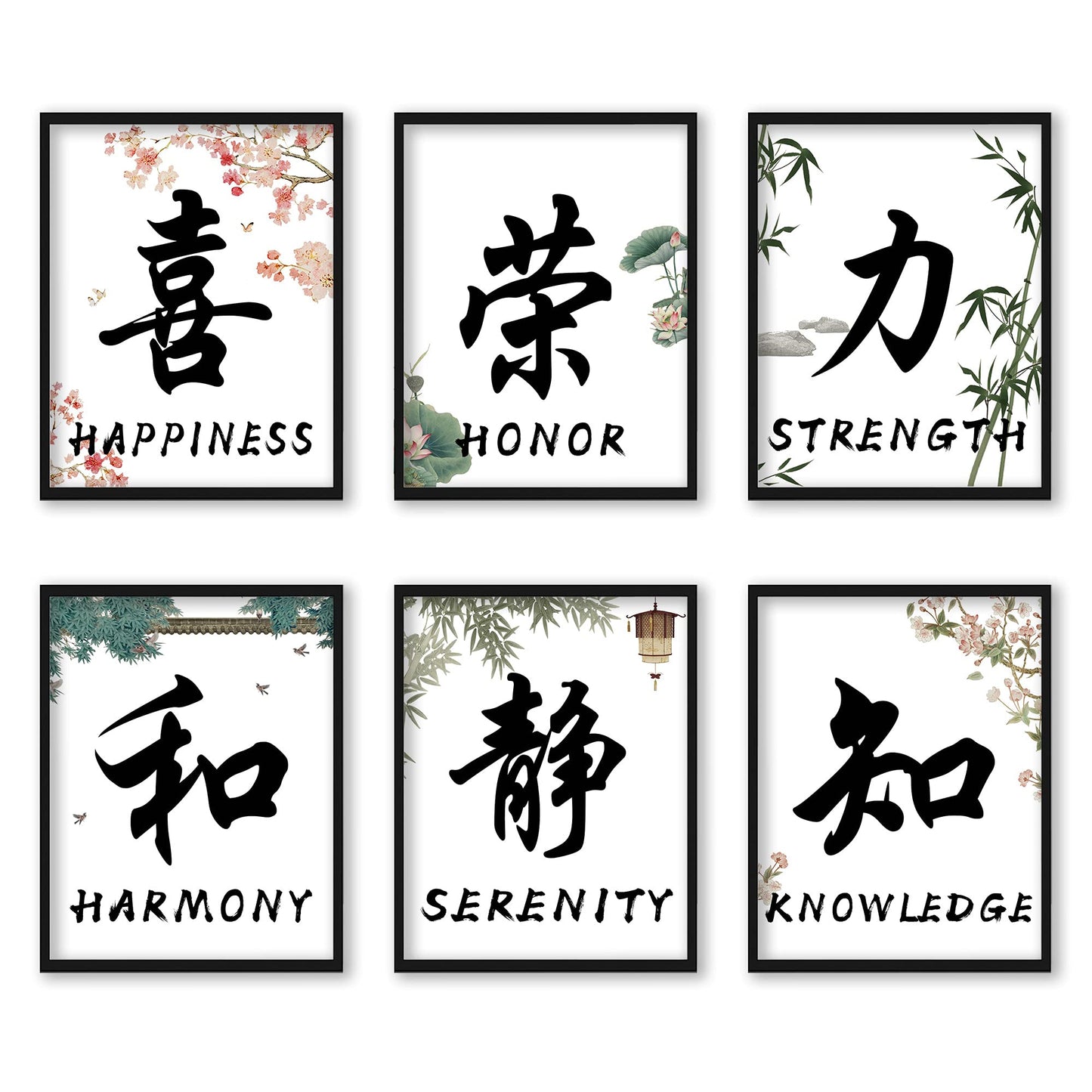 - CHINESE CALLIGRAPHY WALL ART PRINTS: SET of 6 UNFRAMED wall art prints of Chinese characters. This Chinese calligraphy wall art prints are printed with the Chinese characters: happiness, honor, strength, harmony, serenity and knowledge. These words not only express the beautiful meaning, but also give people encouragement and hope.