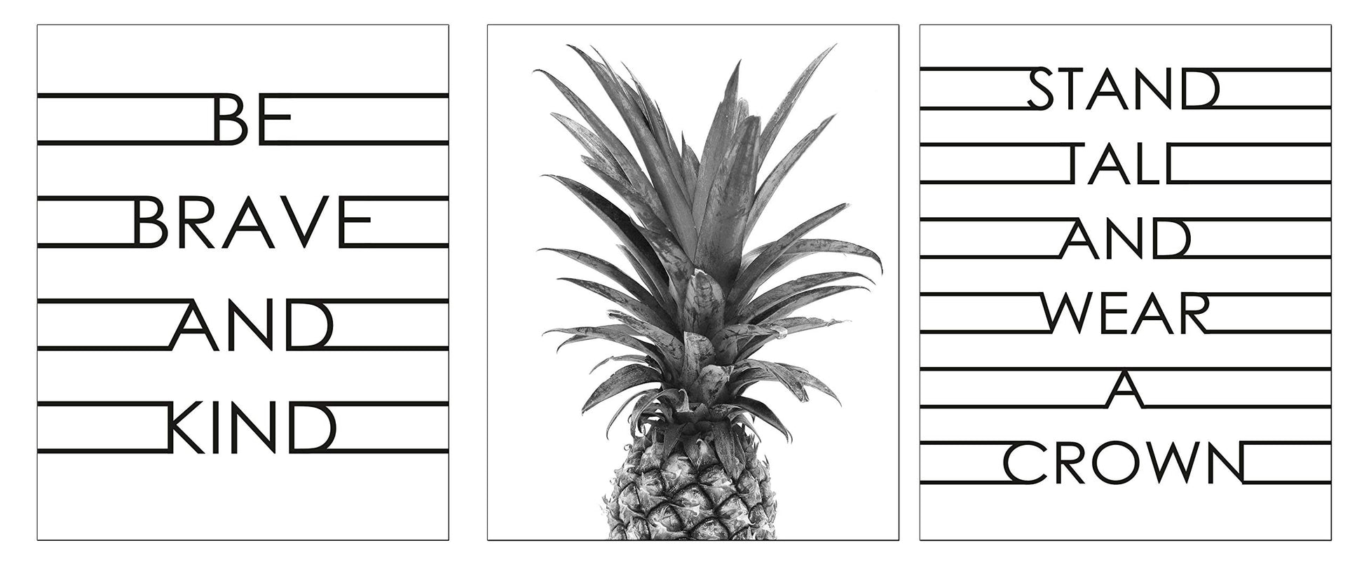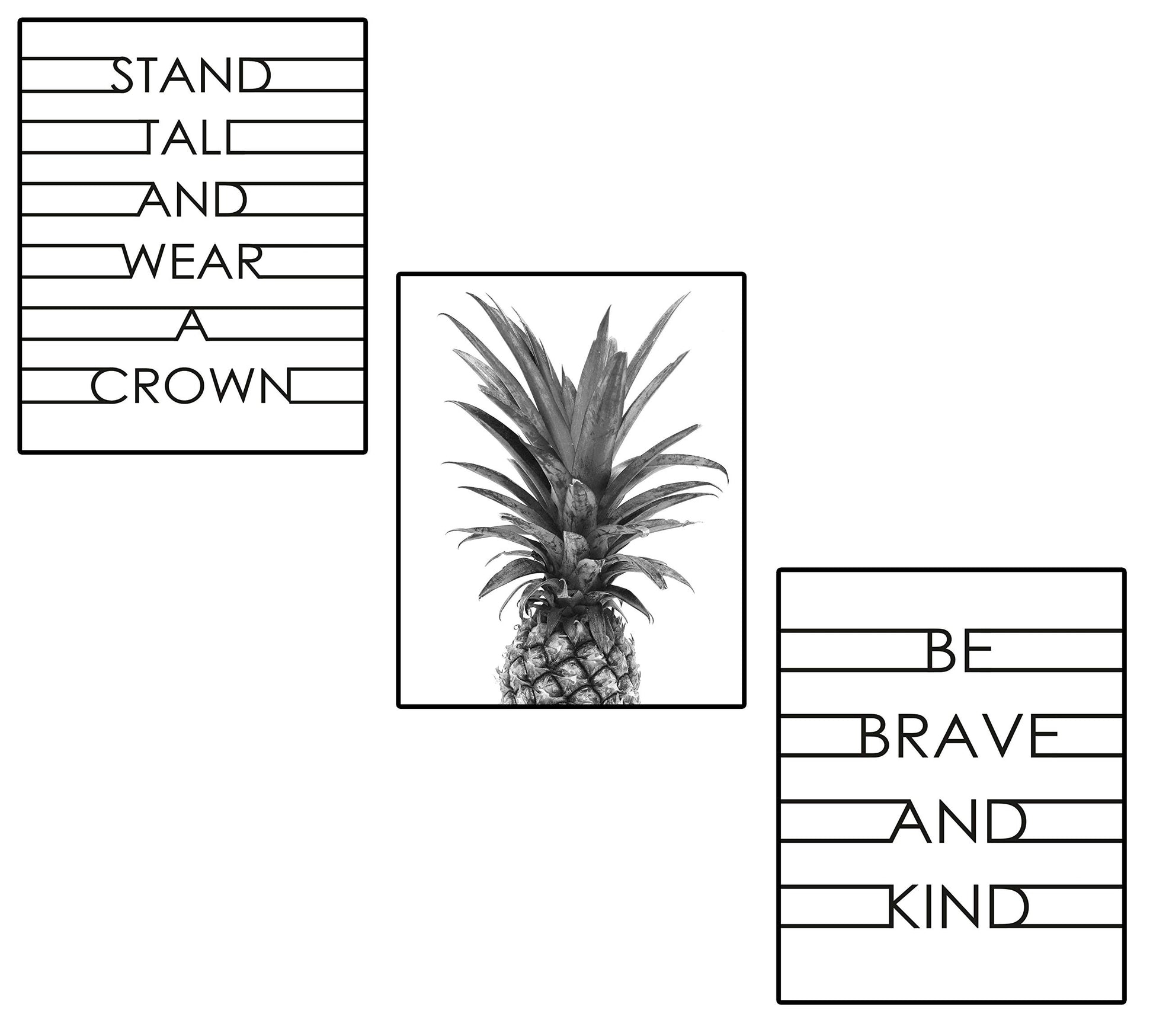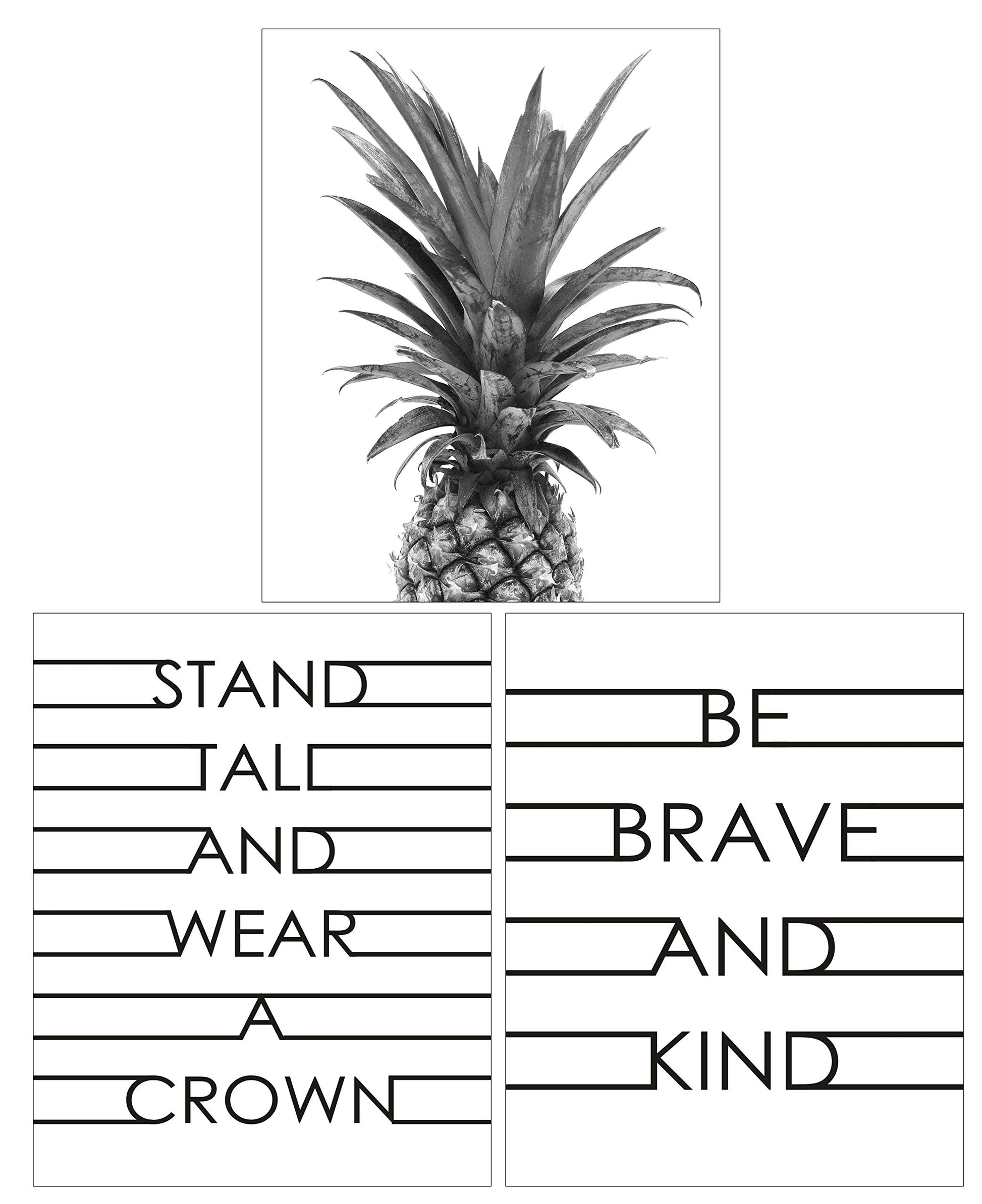 These fine prints are perfect for anyone with an unapologetic love for pineapple décor or beautiful art that inspires smiles with every glimpse. Every 3 piece set comes with one 8” x 10” pineapple, one "Stand tall and wear a crown" print and one "Be kind and brave" print.