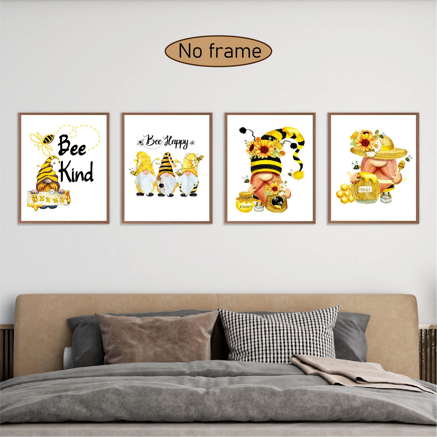VNWEK Bee Kind Bee Happy Cute Sunflower Gnome Floral Inspirational Wall Art Poster Prints Unframed 8”x10”Set Of 4,Funny Gnome Decorations for Home Kitchen Girls Room,Gnome Lovers Women Girls Gifts